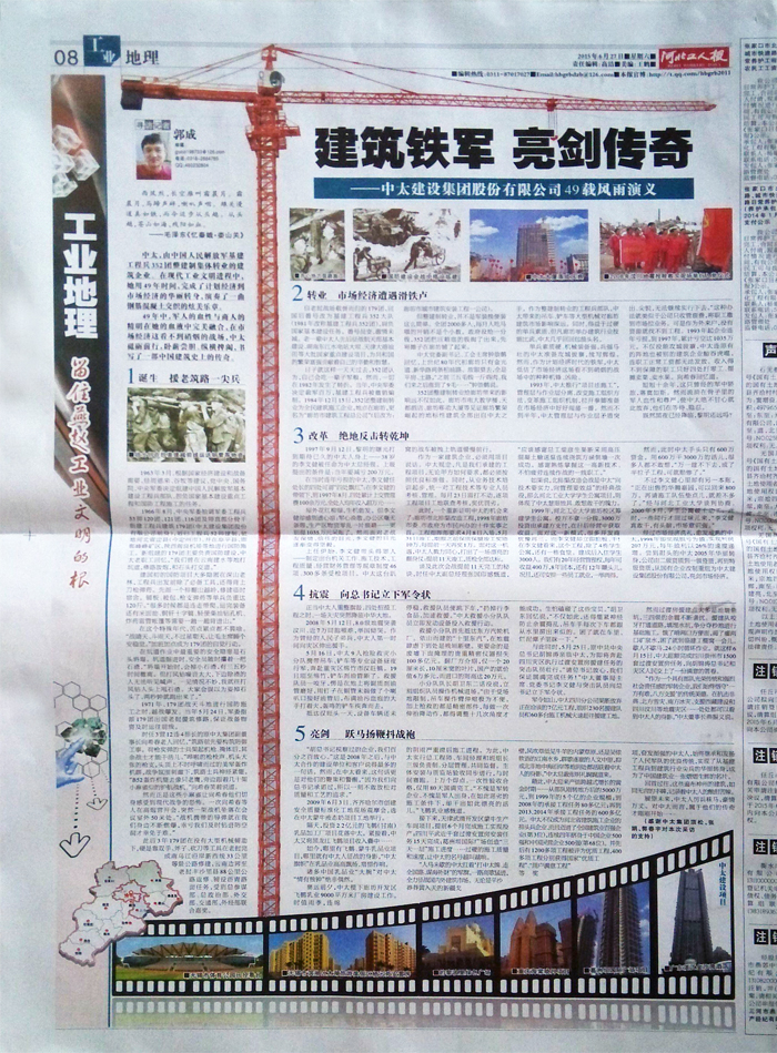 “人馬未歇的中太扛著‘打中太牌、走全國路、謀海外財’的軍旗,一路高歌猛進,全力征戰(zhàn)國內(nèi)外建筑市場。無論是平沙莽莽黃入天的新疆戈壁,風吹草低見牛羊的內(nèi)蒙草原,還是吳儂軟語的江南水鄉(xiāng),群雄逐鹿的人文中原,抑或北非地中海沿岸等地到處都活躍著中太人的身影。”中太總裁張明禮娓娓道來。