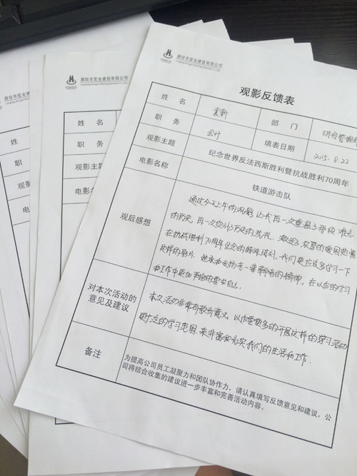 2015年8月22日,為紀(jì)念反法西斯戰(zhàn)爭勝利70周年,宏業(yè)公司組織全體員工進行了一次革命傳統(tǒng)教育活動,觀看了電影《鐵道游擊隊》,一同回顧了那段血淚鑄成的抗戰(zhàn)史,共同緬懷先烈們的英靈。