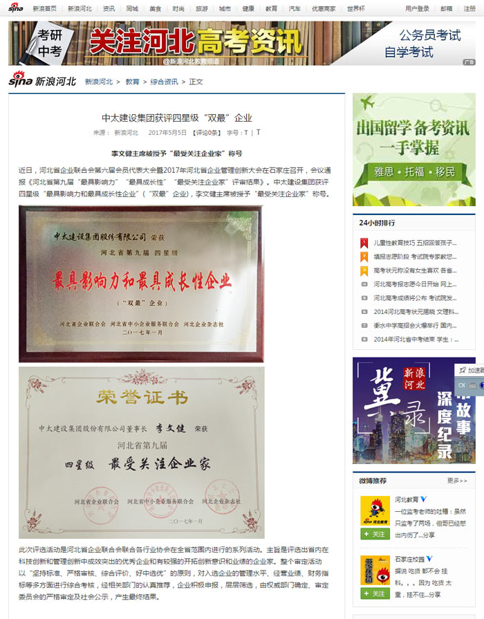 新浪網(wǎng)報道了“中太建設集團獲評四星級“雙最”企業(yè)”