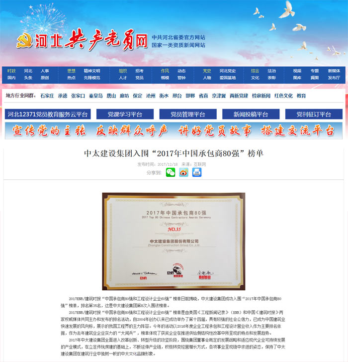 河北共產(chǎn)黨員網(wǎng)報(bào)道了“中太建設(shè)集團(tuán)入圍“2017年中國(guó)承包商80強(qiáng)”榜單”