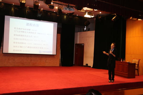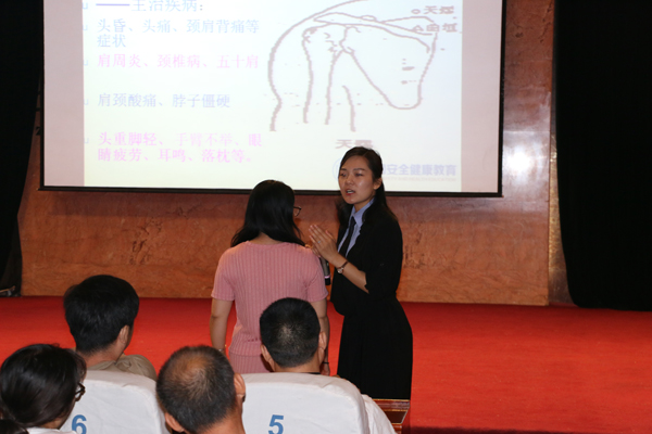 在中國環(huán)境健康與衛(wèi)生安全促進會河北分會的大力支持下,中國安全健康教育中心河北站特邀講師,全民健康咨詢服務(wù)部,省健康教育專業(yè)委員會委員,宣傳科講師彭一茹走進中太大廈,圍繞CPR現(xiàn)場緊急救護知識;環(huán)境污染、室內(nèi)污染的危害及防護知識;經(jīng)絡(luò)穴位養(yǎng)生;常見職業(yè)病的防治;家庭醫(yī)療設(shè)備的正確區(qū)分等內(nèi)容,從實際案例出發(fā),深入淺出、形象生動的剖析健康的重要性以及穴位養(yǎng)生保健的方法,同時還邀請現(xiàn)場員工代表上臺,與老師合作為現(xiàn)場員工形象的解析了經(jīng)絡(luò)穴位治療的原理及療效。彭一如老師的精彩授課得到了在場員工的一致認可。