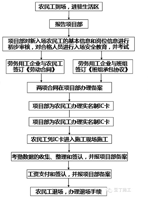 一、公司成立勞務(wù)管理中心,加強(qiáng)各相關(guān)職能部門的監(jiān)督與協(xié)作;分公司參照公司勞務(wù)管理中心機(jī)構(gòu)和人員配置,必須成立分公司勞務(wù)管理中心,并配備勞務(wù)中心主任和相應(yīng)的管理人員。主任:公司分管勞務(wù)領(lǐng)導(dǎo) 組員:公司經(jīng)濟(jì)管理部、財(cái)務(wù)部、安全管理部、質(zhì)量技術(shù)部、法律事務(wù)部、政工部等部門負(fù)責(zé)人,公司勞務(wù)管理員、分公司勞務(wù)管理中心主任,各項(xiàng)目部。 項(xiàng)目部勞務(wù)管理機(jī)構(gòu)項(xiàng)目經(jīng)理部必須成立勞務(wù)管理領(lǐng)導(dǎo)小組,項(xiàng)目部勞務(wù)管理領(lǐng)導(dǎo)小組主要人員設(shè)置及要求如下:1、項(xiàng)目經(jīng)理為項(xiàng)目勞務(wù)管理工作的第一責(zé)任人。2、項(xiàng)目部必須設(shè)置一名副職以上人員作為勞務(wù)管理工作的第二責(zé)任人,其專職或兼職主管勞務(wù)日常管理工作。3、項(xiàng)目部使用勞務(wù)分包企業(yè)人員500人以上,必須設(shè)置專職勞務(wù)管理員1-4名;500人以下100人以上,必須設(shè)置至少1名專職勞務(wù)管理員;100人以下必須設(shè)置兼職勞務(wù)管理人員。 勞務(wù)管理員的薪酬不低于項(xiàng)目責(zé)任工程師的薪酬標(biāo)準(zhǔn)。4、項(xiàng)目勞務(wù)管理不只是勞務(wù)管理員的職責(zé),項(xiàng)目部相關(guān)部門必須直接參與勞務(wù)日常管理工作;各項(xiàng)目部根據(jù)項(xiàng)目實(shí)際情況,編制《項(xiàng)目勞務(wù)管理方案》,根據(jù)各項(xiàng)任務(wù)分解,方案中必須明確勞務(wù)管理領(lǐng)導(dǎo)小組成員和崗位職責(zé),以及應(yīng)急預(yù)案。5、勞務(wù)分包合同中須明確約定現(xiàn)場(chǎng)各分包隊(duì)伍必須設(shè)置一名以上專職勞務(wù)管理員。一、做好農(nóng)民工進(jìn)場(chǎng)施工前的各項(xiàng)手續(xù)1、如何做到勞務(wù)分包隊(duì)伍自覺向項(xiàng)目部申報(bào)施工人員進(jìn)場(chǎng)情況的關(guān)鍵是:現(xiàn)場(chǎng)封閉管理——沒有按規(guī)定辦理手續(xù)堅(jiān)決不能進(jìn)入施工現(xiàn)場(chǎng)。2、七天內(nèi)辦理好以下相關(guān)手續(xù),考慮到現(xiàn)場(chǎng)施工和減少作業(yè)人員等待時(shí)間的需要,可以優(yōu)先上報(bào)花名冊(cè)和辦理IC卡,但其他手續(xù)辦理完成以7天為管理底線。3、《勞動(dòng)合同》是國(guó)家《勞動(dòng)合同法》明文規(guī)定要簽訂的,但建筑行業(yè)農(nóng)民工群體執(zhí)行普遍不好,但涉及到勞務(wù)糾紛時(shí),政府是依照《勞動(dòng)合同》辦理。《班組承包協(xié)議》不同于集體合同,是民間行為,目前階段以及政府為了維穩(wěn),該協(xié)議是不受法律保護(hù)的,但大部分老板與作業(yè)人員在建立相互信任、協(xié)商的基礎(chǔ)上,基本上都是按照班組承包協(xié)議辦理結(jié)算。4、安全入場(chǎng)教育及考試等也是《勞動(dòng)合同法》中要求施工企業(yè)做到的 。