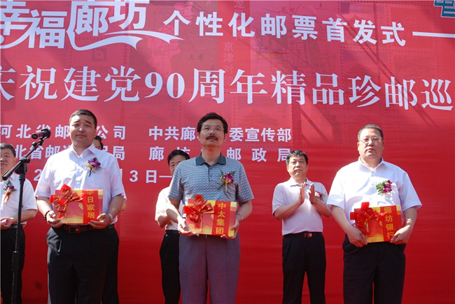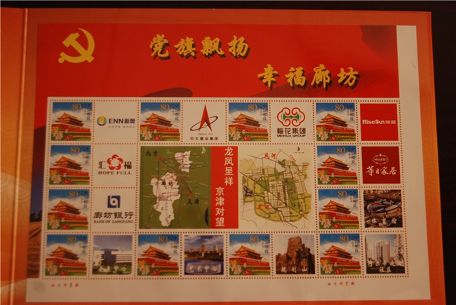 6月3日上午,由廊坊市委宣傳部與廊坊市郵政局共同推出的《黨旗飄揚(yáng) 幸福廊坊》個(gè)性化郵票在廊坊市博物館舉行首發(fā)式。《黨旗飄揚(yáng)·幸福廊坊》個(gè)性化郵票共“1+12”幅圖案。“1”即中心主圖案,體現(xiàn)廊坊市“龍鳳呈祥,京津?qū)ν钡膮^(qū)位優(yōu)勢,“12”即12幅輔圖,其中4幅分別為會(huì)展中心、居民小區(qū)、文化藝術(shù)中心、中央生態(tài)城,體現(xiàn)“智能、生態(tài)、商務(wù)、休閑”的廊坊