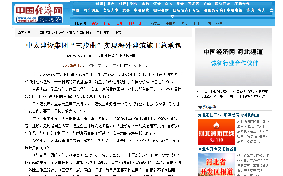 中國經(jīng)濟網(wǎng)報道了中太建設(shè)集團“三步曲”實現(xiàn)海外建筑施工總承包