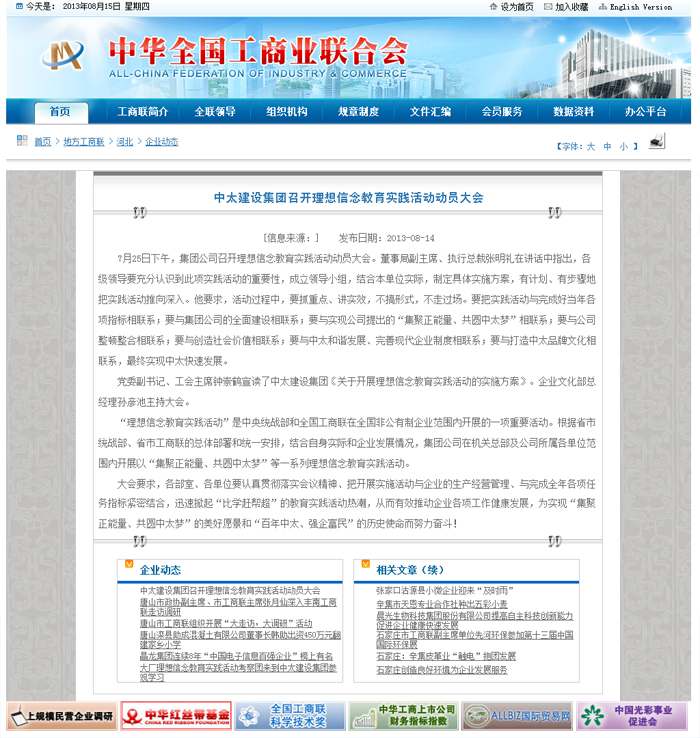 | 全國(guó)工商聯(lián)網(wǎng)站8月14日?qǐng)?bào)道了中太建設(shè)集團(tuán)召開理想信念教育實(shí)踐活動(dòng)動(dòng)員大會(huì) |