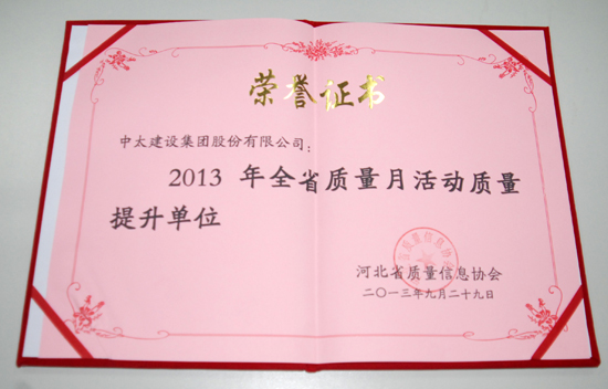 日前,中太建設(shè)集團(tuán)被河北省質(zhì)量信息協(xié)會(huì)評為“2013年全省質(zhì)量月活動(dòng)質(zhì)量提升單位”。