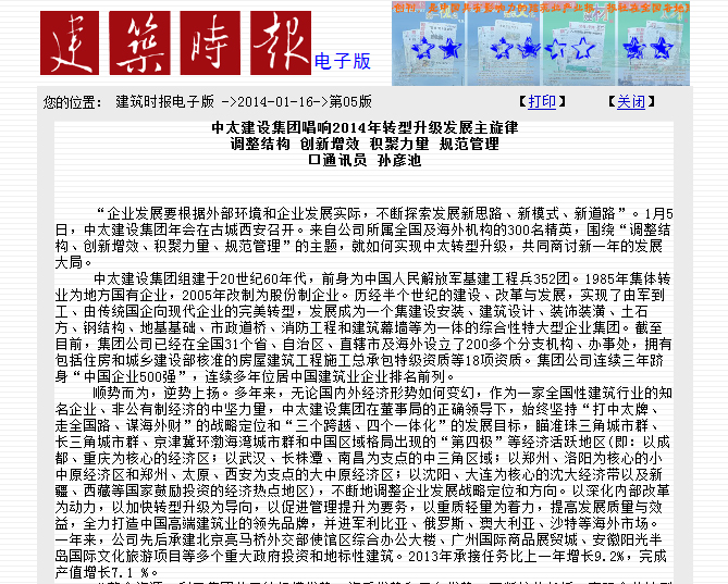建筑時報2014年1月16日報道了中太建設(shè)集團(tuán)唱響2014年轉(zhuǎn)型升級發(fā)展主旋律