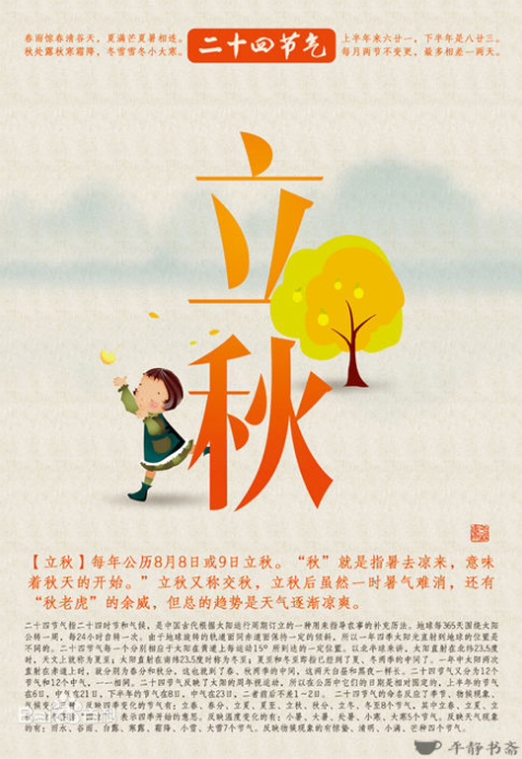 今天是立秋,意味著夏季的結(jié)束,秋季的開始,氣溫逐漸下降,雨水逐漸減少。我國幅員遼闊,就節(jié)氣而言不可能同時(shí)進(jìn)入涼爽的秋季的,是有一些差別的。生活在廊坊這個(gè)地方,四季分明的氣候,是老天恩賜的福分。不冷不熱的天,氣候宜人,真正是秋高氣爽。我國古代將秋季劃分為三候:一候涼風(fēng)至,二候白露生,三候寒蟬鳴。是說立秋后刮風(fēng)人們會(huì)感到?jīng)鏊蟮卦绯繒?huì)有霧氣產(chǎn)生,并且秋天感陰而鳴的寒蟬也開始鳴叫。民間流行“貼秋膘”,就是在立秋這天吃些美味佳肴,老百姓家就是燉肉、包餃子。